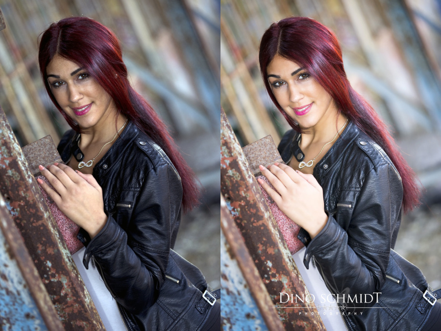 Links seht ihr das Bild, wie es direkt aus der Kamera kommt. Durch die Lichtsituation vor Ort war das Bild etwas unterbelichtet und farblich etwas flau. Das habe ich ebenso korrigiert wie eine Beautyretusche an den Haaren und der Haut vorgenommen. Die Bearbeitung umfasst etwa 15 unterschiedliche Bereiche und dauerte hier etwa 15 Minuten. Hättet ihr das gedacht? Kommen dazu noch weitere Arbeiten, wie beispielsweise Farbveränderungen oder Änderungen an der Sonneneinstrahlung und so weiter, kann eine Bearbeitung auch durchaus mal 45 Minuten dauern.