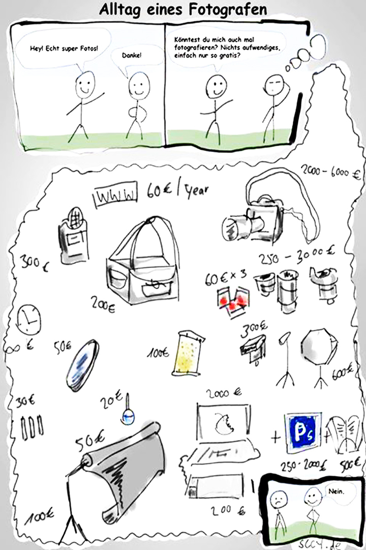 Dazu kommen natürlich jene Kosten, die bereits aus der Karikatur oben ersichtlich sind und anteilig berücksichtigt werden müssen. Die Wiederbeschaffung von Kameras, Objektiven, Blitzen, Computer, Software, Verbrauchsmaterial, Filter, Softboxen, Funkempfängern, und und und... Gutes Fotoequipment ist äußerst teuer und muss bereits nach wenigen Jahren ersetzt werden. Hier einige Beispiele: